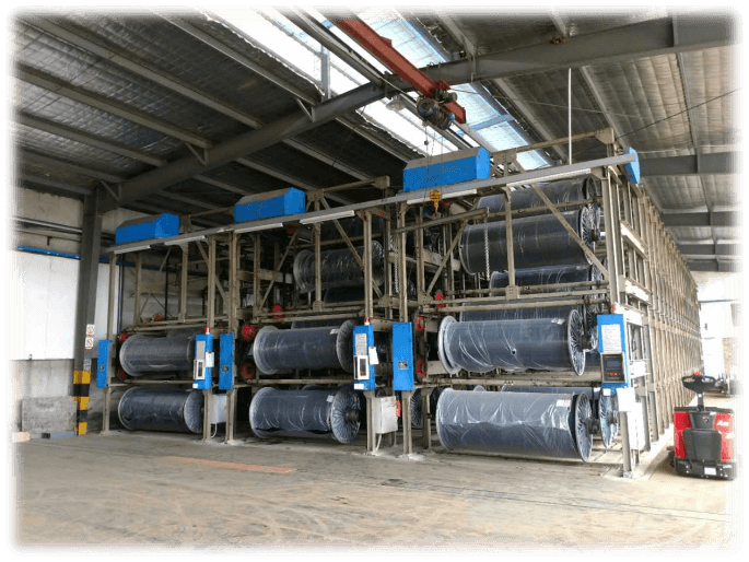 经轴存储采用自动仓库形式,有效利用空间,提升仓储利用率;有效控制FIFO,库存位置、数量清晰,减少物流人力成本,提高工作效率。轴库是存储经轴,浆轴,织轴,布卷的最佳选 择,被广泛的用于织前准备 ,织造厂,染整厂,是纺织厂有效利用空间,减少占地,增加储量,高效存取,实现现代化智能化管理的理想设备。